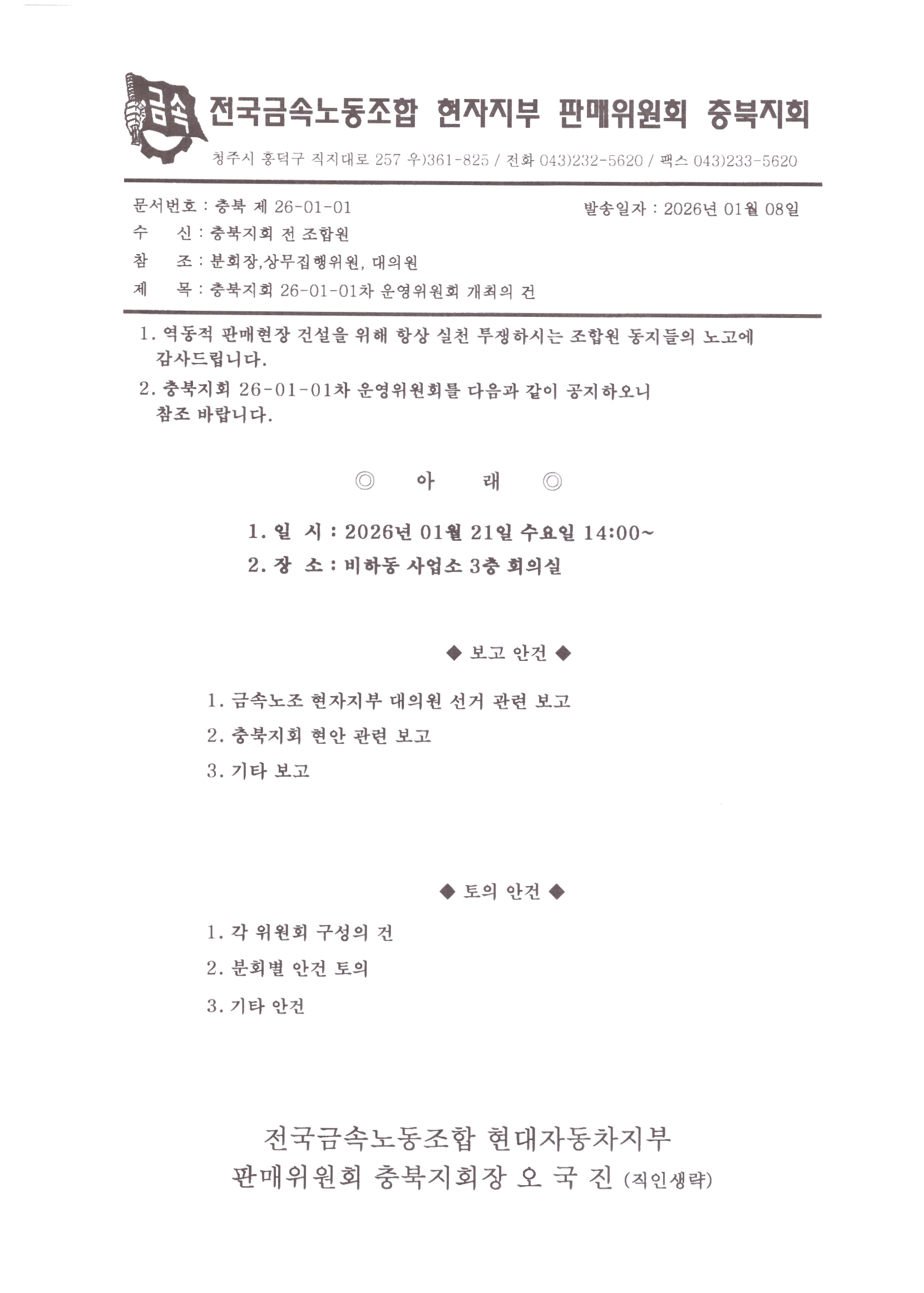 [°ø¹®]ÃæºÏÁöȸ 26-01-01Â÷ ¿î¿µÀ§¿øÈ¸ °³ÃÖÀÇ °Ç