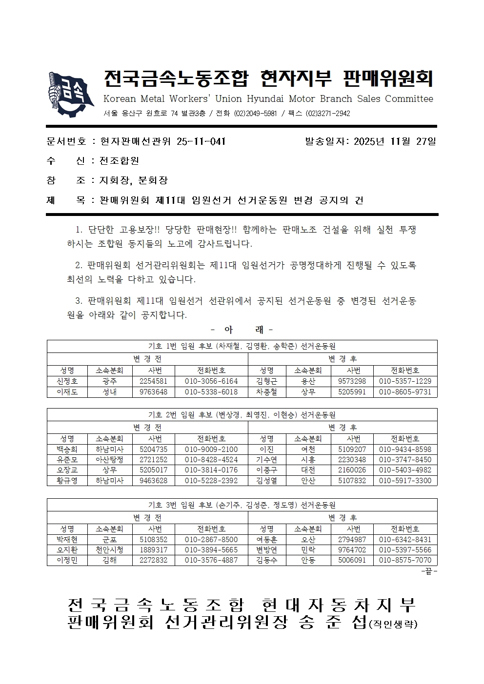 [¼±°üÀ§ °ø¹®] ÆÇ¸ÅÀ§¿øÈ¸ Á¦11´ëÀÓ¿ø¼±°Å ¼±°Å¿îµ¿¿ø º¯°æÀÇ °Ç