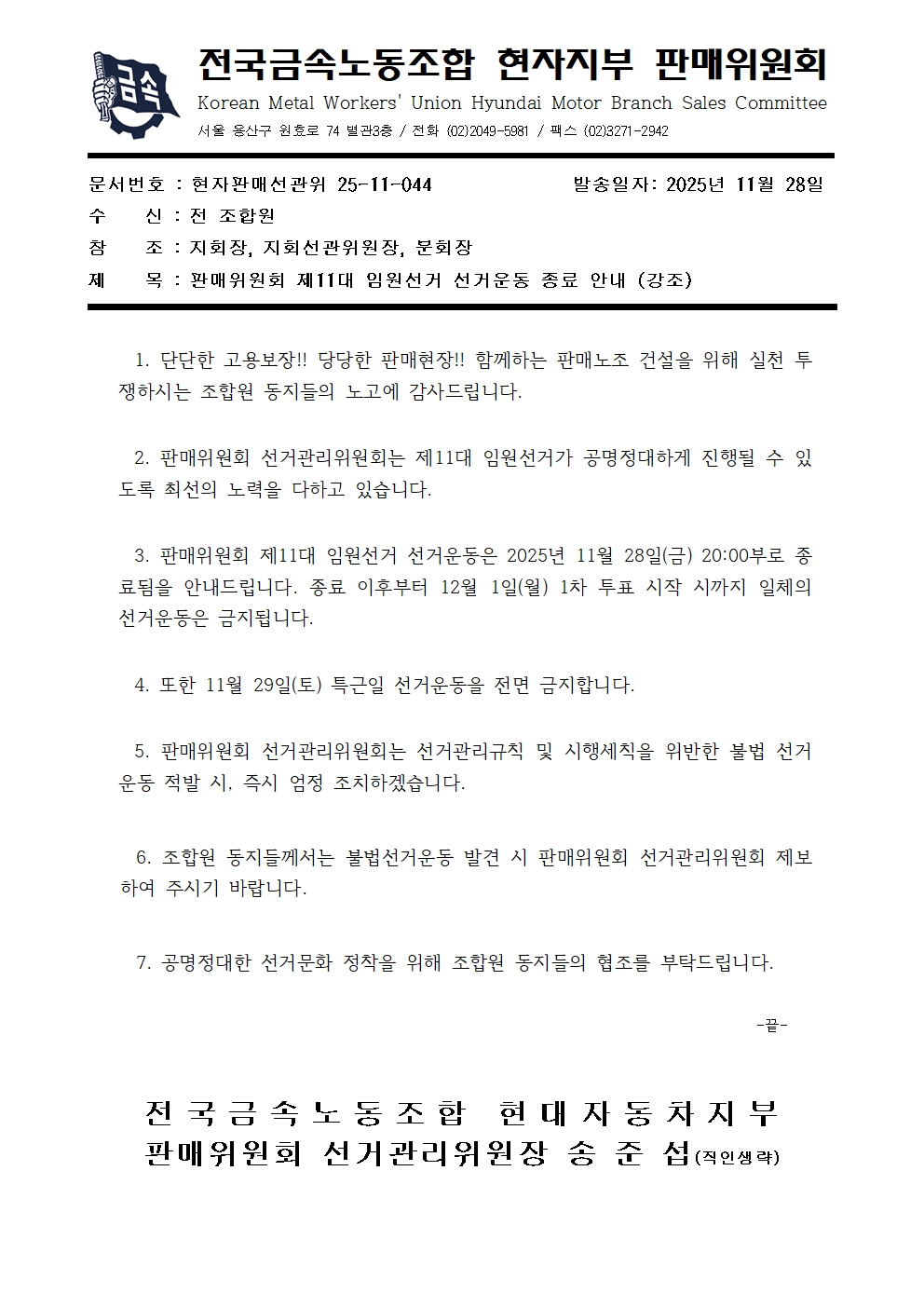 [¼±°üÀ§ °ø¹®] Á¦11´ë ÀÓ¿ø¼±°Å ¼±°Å¿îµ¿ Á¾·á ¹× ºÒ¹ý ¼±°Å¿îµ¿ ±ÝÁö ¾È³»