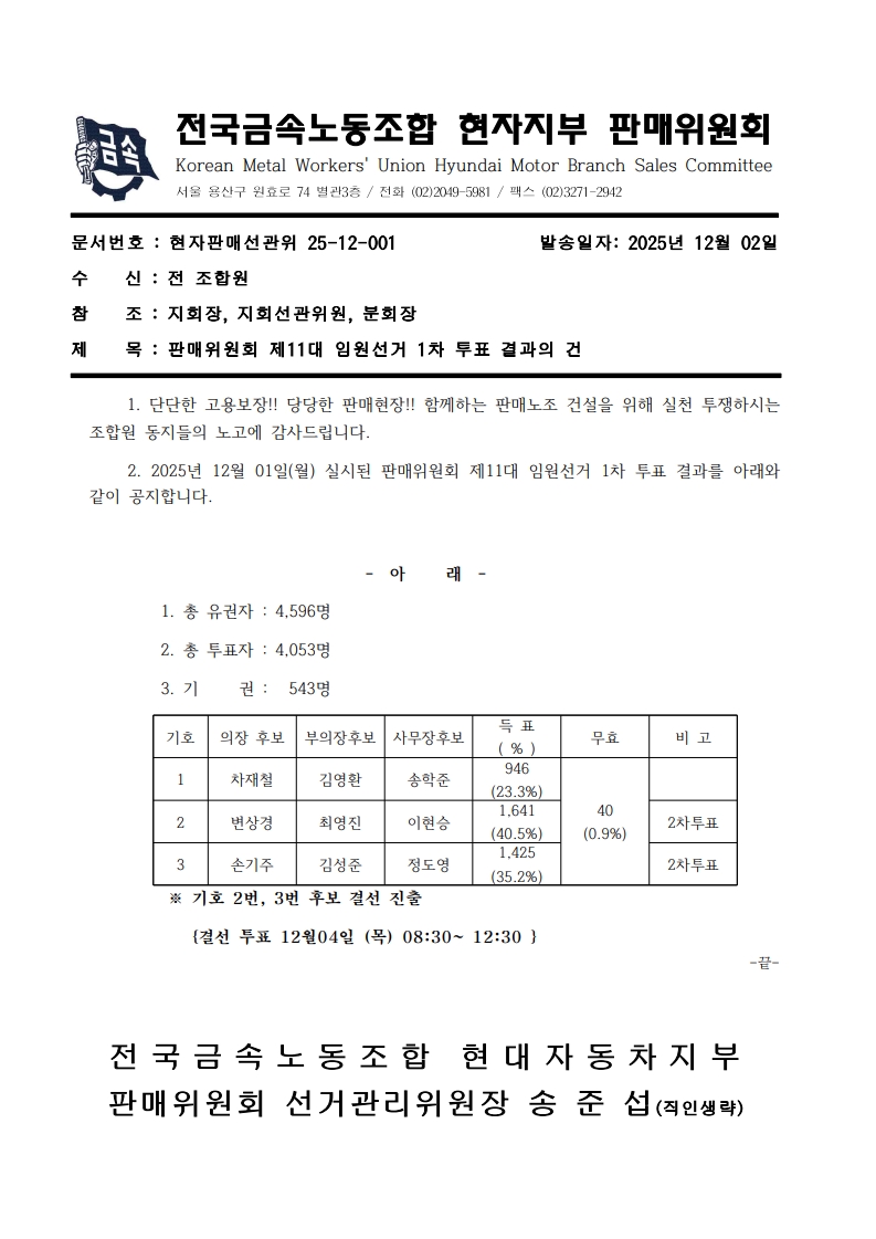 [¼±°üÀ§ °ø¹®] ÆÇ¸ÅÀ§¿øÈ¸ Á¦11´ë ÀÓ¿ø¼±°Å 1Â÷ ÅõÇ¥ °á°úÀÇ °Ç